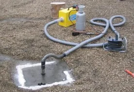 L’injection de fumigène permet de vérifier l’étanchéité sur les terrasses et les toitures. Un mélange d’air et de fumée est injecté sous la surface d’étanchéité. Pour une terrasse recouverte de gravillons, un film de protection est ajouté.